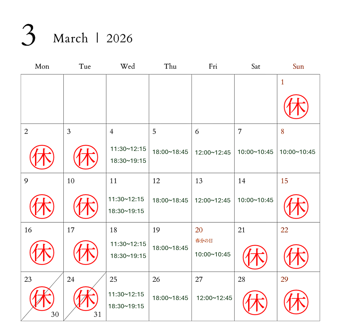 2月・3月のヨガレッスンスケジュールをお知らせいたします。